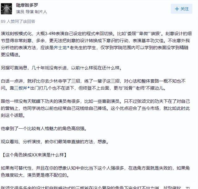 2023年2月,知乎上一位网名为毗摩智多罗的用户,在“张颂文演技如何”的话题讨论中,发表了一番与众不同的看法。
